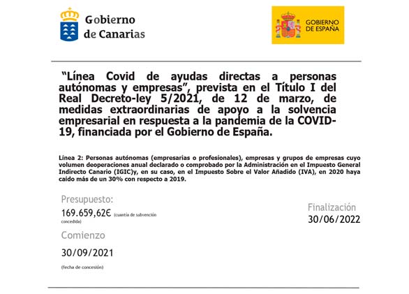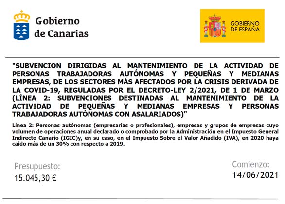 • Recibida la subvención «DIRIGIDAS AL MANTENIMIENTO DE LA ACTIVIDAD DE PERSONAS TRABAJADORAS AUTÓNOMAS Y PEQUEÑAS Y MEDIANAS EMPRESAS, DE LOS SECTORES MÁS AFECTADOS POR LA CRISIS DERIVADA DE LA COVID-19, REGULADAS POR EL DECRETO-LEY 2/2021, DE 1 DE MARZO (LÍNEA 2: SUBVENCIONES DESTINADAS AL MANTENIMIENTO DE LA ACTIVIDAD DE PEQUEÑAS Y MEDIANAS EMPRESAS Y PERSONAS TRABAJADORAS AUTÓNOMAS CON ASALARIADOS)» por un importe de 045,30 Euros con fecha de concesión 14/06/2021